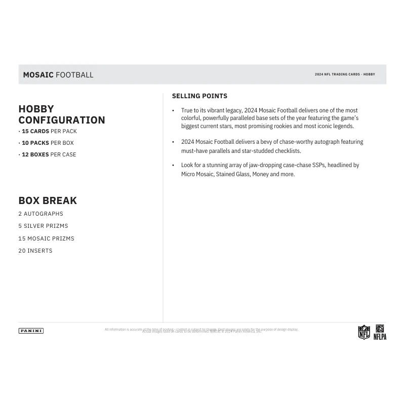 - True to its vibrant legacy, 2024 Mosaic Football delivers one of the most colorful, powerfully paralleled base sets of the year featuring the game’s biggest current stars, most promising rookies and most iconic legends.